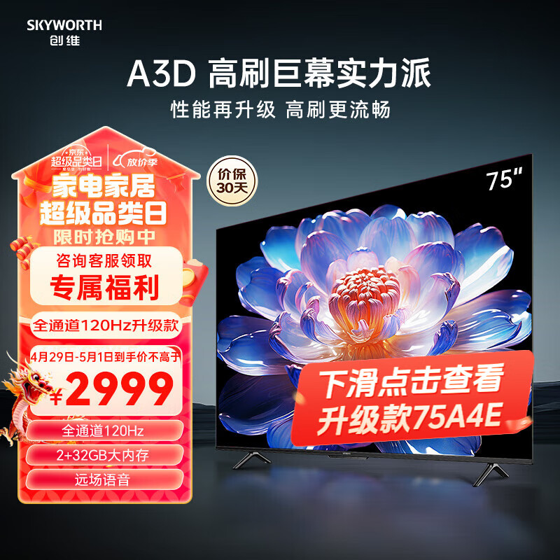 创维电视75A3D 75英寸120Hz高刷 2+32GB远场语音 4K高清智慧屏超薄液晶平板电视机 以旧换新75M3D 75英寸价格:2799.00元!