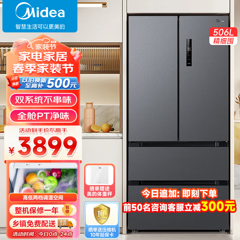 美的(Midea)532法式多门四开门冰箱变频一级能效家用大容量无霜双系统双循环电冰箱MR-532WFPZE价格:4298.00元!