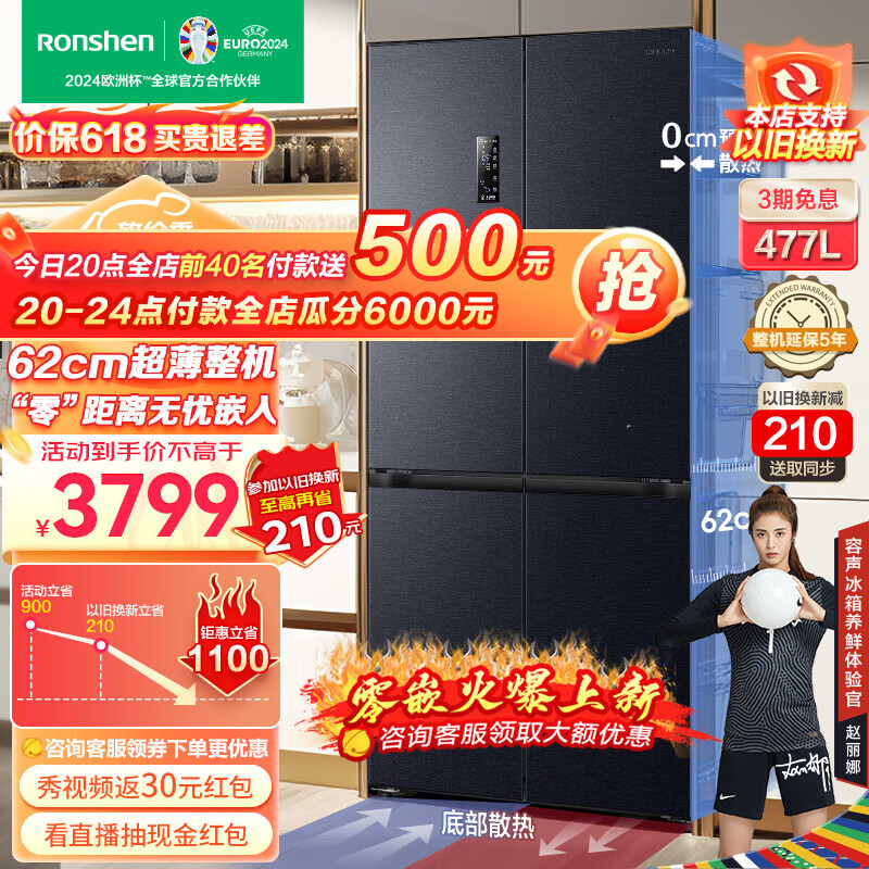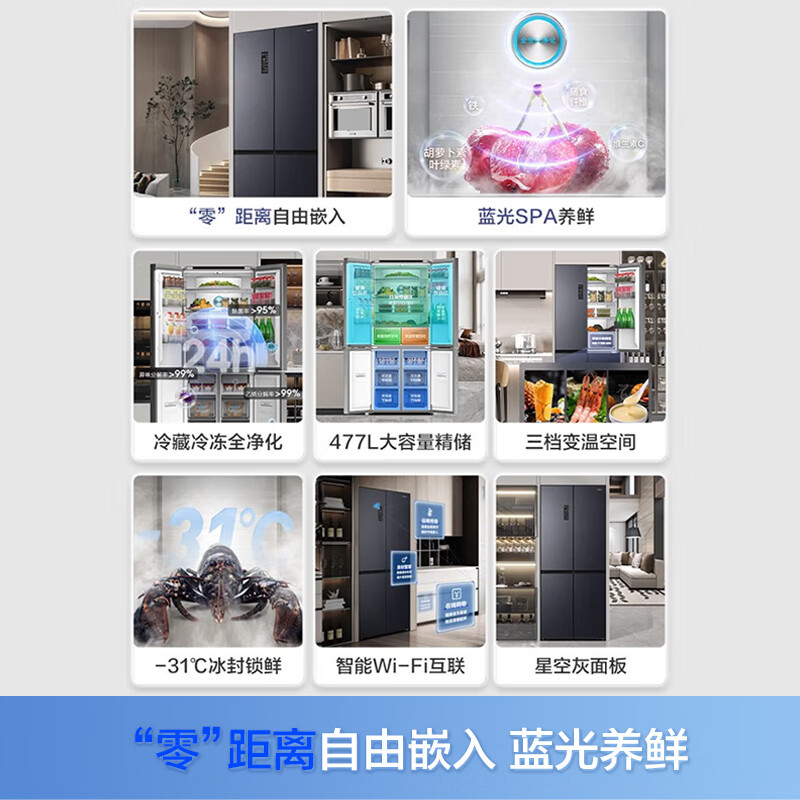 容声蓝光零嵌477升十字双开四开门一级能效变频超薄零嵌入底部散热可嵌入智能WIFI大容量冰箱 BCD-477WD3FPLA-星空灰价格:4699.00元!