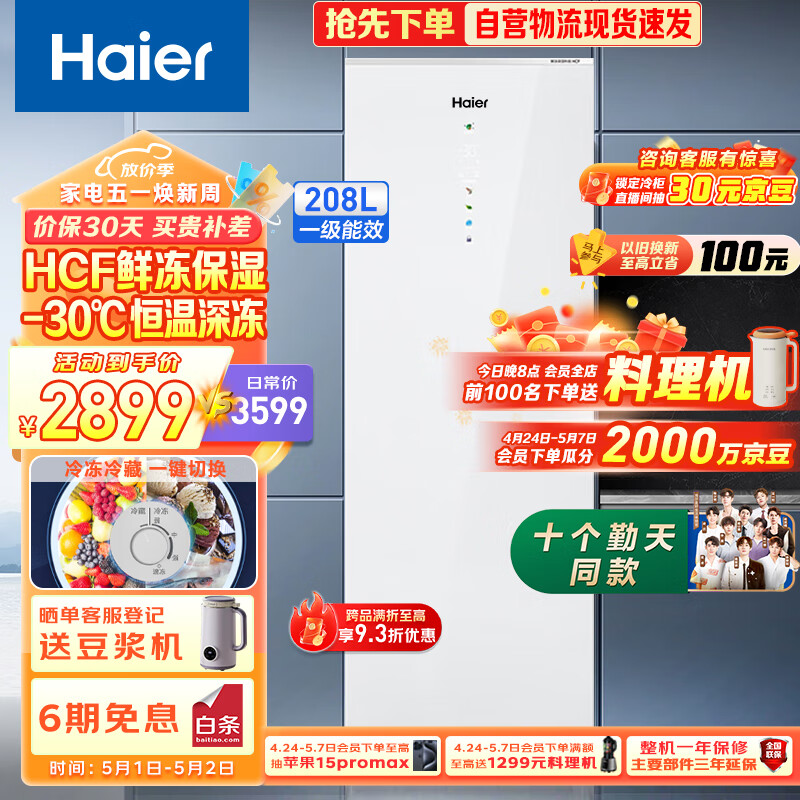 海尔(Haier)珍味系列208升风冷家用立式冰柜 冷藏冷冻柜抽屉式冷柜小冰柜家用小冰箱BD-208WGHW1以旧换新价格:3099.00元!