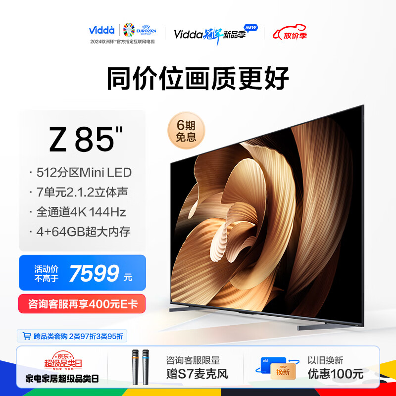 Vidda Z85 海信 85英寸 Mini LED 4+64G 512分区 1100nit 240Hz游戏智能液晶电视以旧换新85V7K价格:7599.00元!