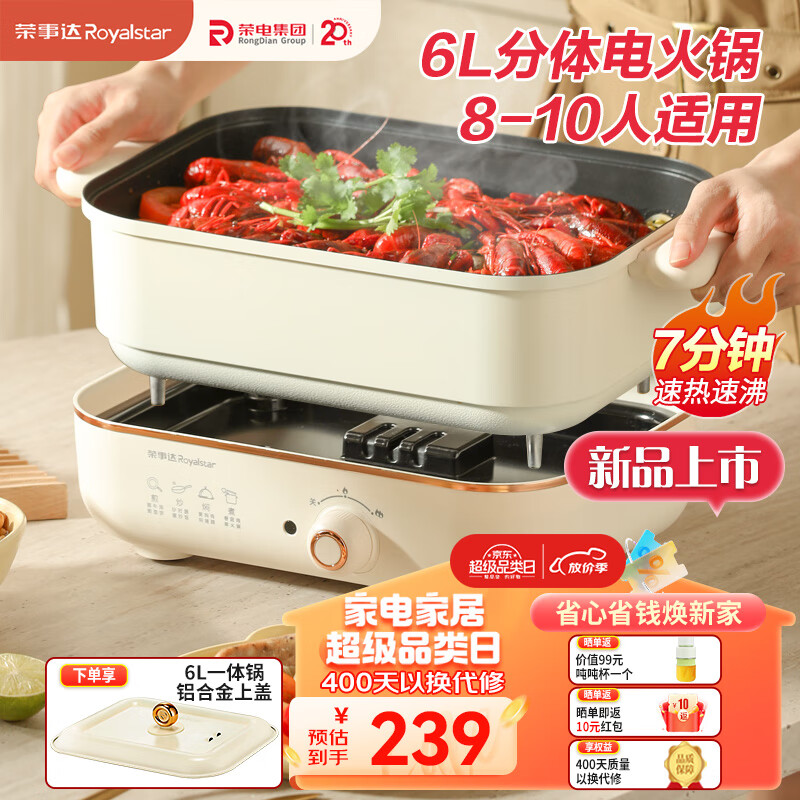 荣事达(Royalstar)电火锅分体式多用途锅电煮锅多功能锅家用电热锅料理涮肉锅火锅锅具6L DZG60E价格:239.00元!