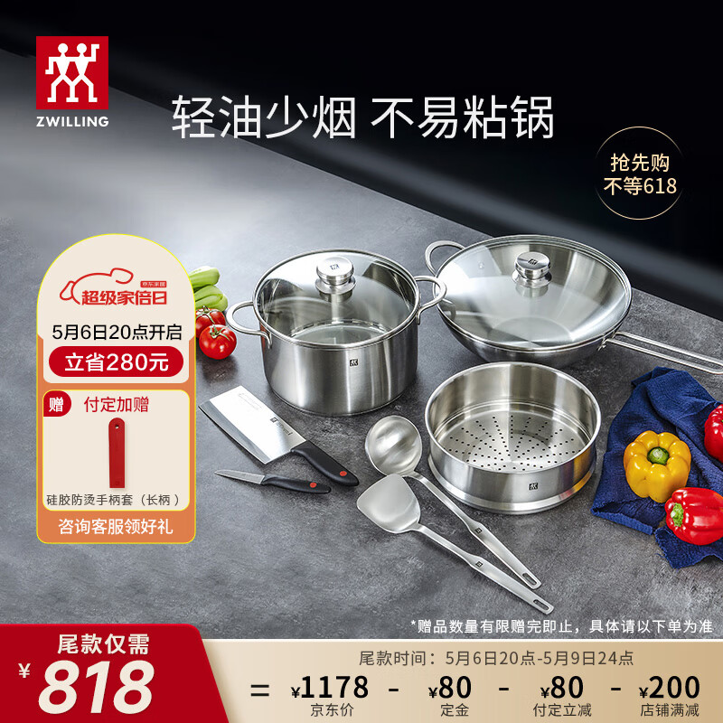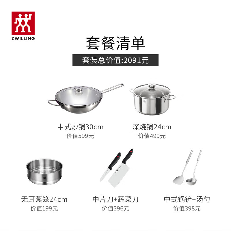 双立人(ZWILLING)锅具套装不锈钢炒锅汤锅蒸笼切菜刀水果刀锅铲汤勺 厨具百年经典价格:1098.00元!