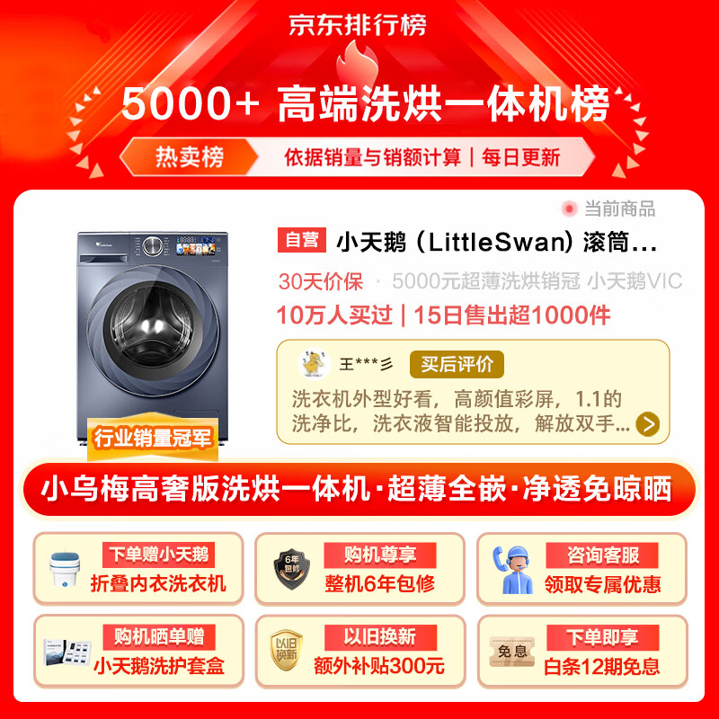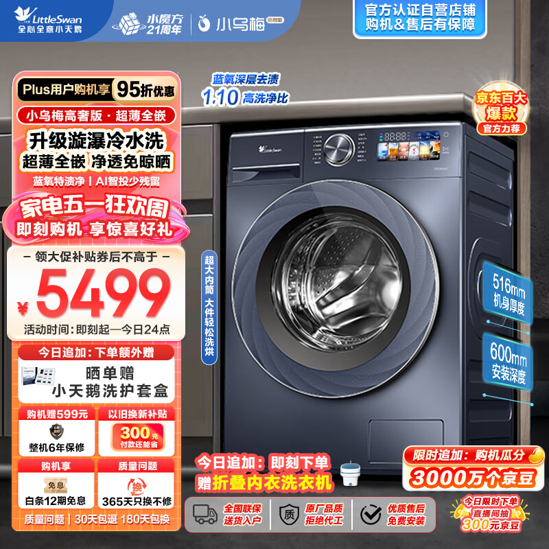 小天鹅(LittleSwan)滚筒洗衣机全自动 超薄全嵌【小乌梅高奢版TD100VIC】洗烘一体机 516mm机身 蓝氧特渍净 10公斤价格:5999.00元!