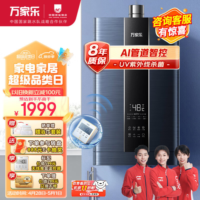 万家乐 16升燃气热水器家用恒温天然气 增压零冷水紫外线杀菌儿童浴 双屏分控APP控制 厨房洗JSQ30-16RL6价格:1999.00元!