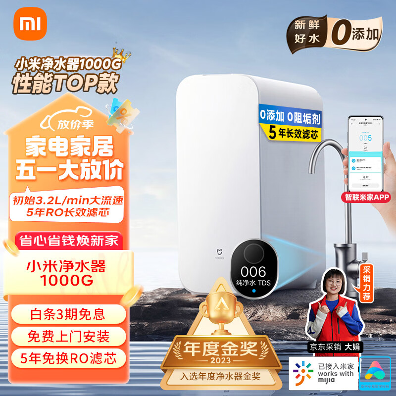 米家小米净水器家用净水机1000G 新鲜无陈水低噪省水 5年RO反渗透 厨下直饮净水器 2.65L/分价格:1799.00元!