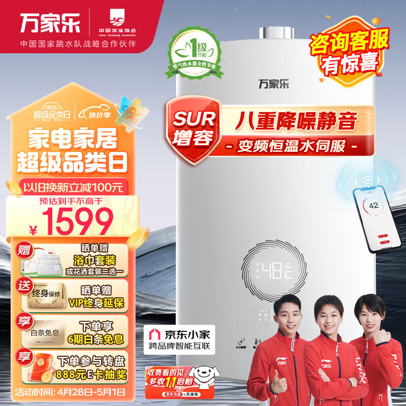 万家乐16升燃气热水器变频水伺服恒温负压增氧降噪增容防冻京东小家智能JSQ30-16DS8(F)【真·一级节能】价格:1589.00元!