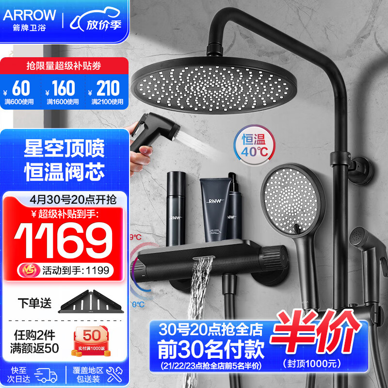 箭牌(ARROW)恒温花洒套装冷热家用卫生间挂墙式淋浴增压喷头套装 星空顶恒温花洒34120HMB价格:1410.00元!