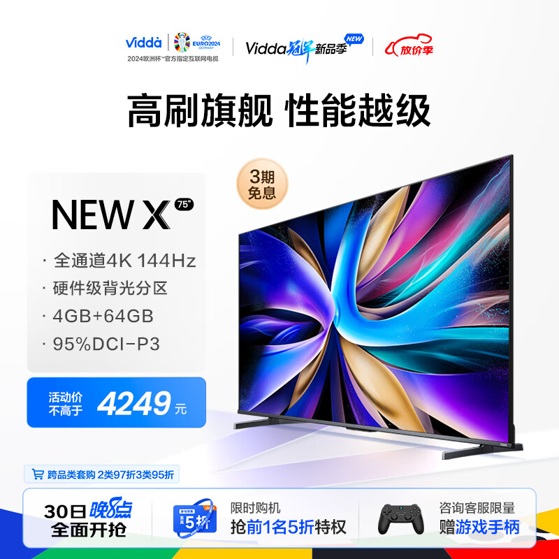 Vidda 海信电视 NEW X75 75英寸游戏电视 144Hz高刷 HDMI2.1金属屏 4+64G 液晶巨幕以旧换新75V3K-X价格:4249.00元!