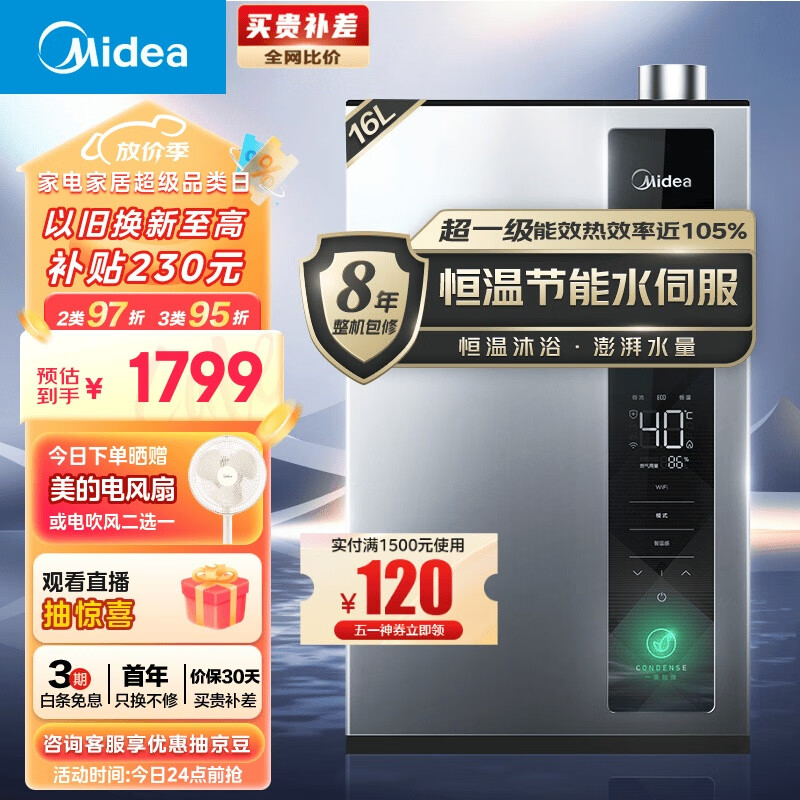 美的(Midea)16升燃气热水器 天然气 超一级能效 智控水伺服 家用省气 恒温节能 JSLQ27-16LN1影墨 以旧换新价格:1799.00元!