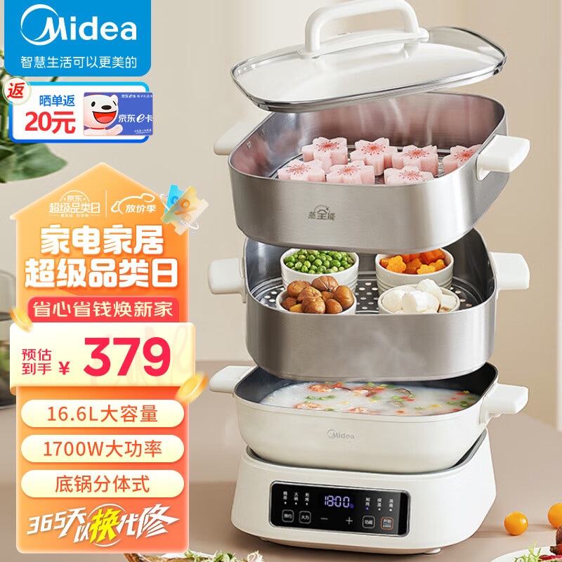 美的(Midea)电蒸锅 电煮锅 电火锅 多功能锅家用电锅蒸包子锅蒸全能三层大容量多用途锅 ZGC282802价格:429.00元!