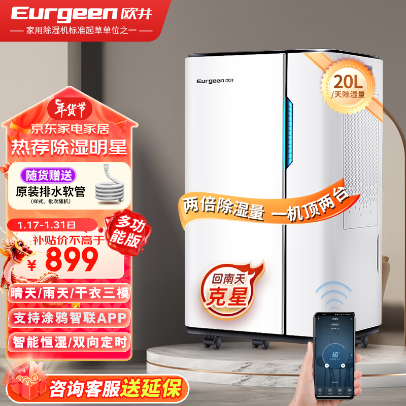 欧井(Eurgeen)除湿机/抽湿机 除湿量20升/天 适用面积40-120㎡ 家用地下室轻音净化干衣吸湿器 OJ-231E价格:998.00元!