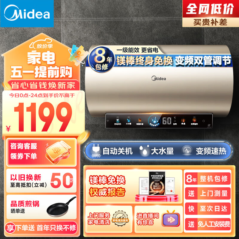 美的(Midea)终身免换镁棒60升电热水器家用储水式3300W/2300W速热变频省电一级能效低耗节能F6033-JE6(HE)价格:1399.00元!