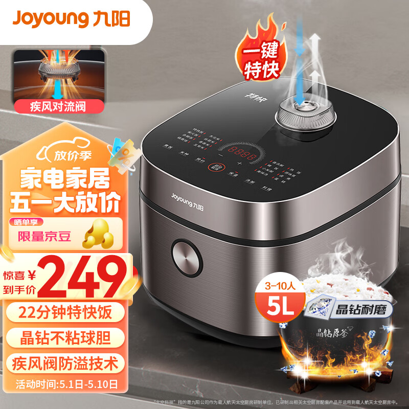 九阳(Joyoung)家用5L大容量3~10人多功能电饭煲电饭锅晶钻球胆22分钟特快饭顶置操控面板不粘饭煲5升50FY661价格:299.00元!