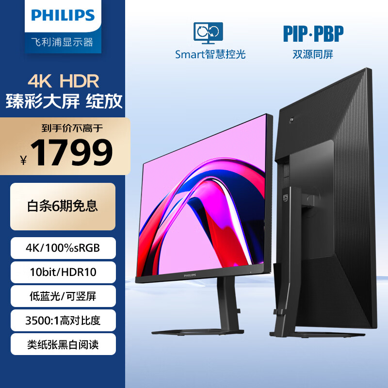 飞利浦 31.5英寸4K 10bit HDR低蓝光 分屏 旋转升降 设计办公显示器 娱乐大屏 电脑显示屏 32E1N5800L价格:1899.00元!