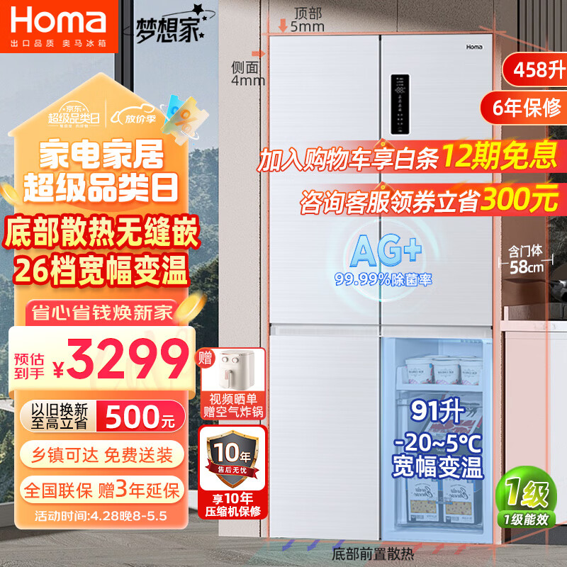奥马(Homa)60cm以下超薄零嵌入式450升一级能效变频大容量十字对开门四门家用电冰箱底部散热BCD-450pro价格:4199.00元!