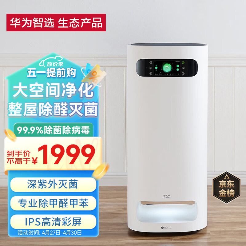 华为智选720空气净化器1PRO 专业级除甲醛双重除菌除异味除过敏原 99.99%消毒性能 家用大空间价格:2299.00元!