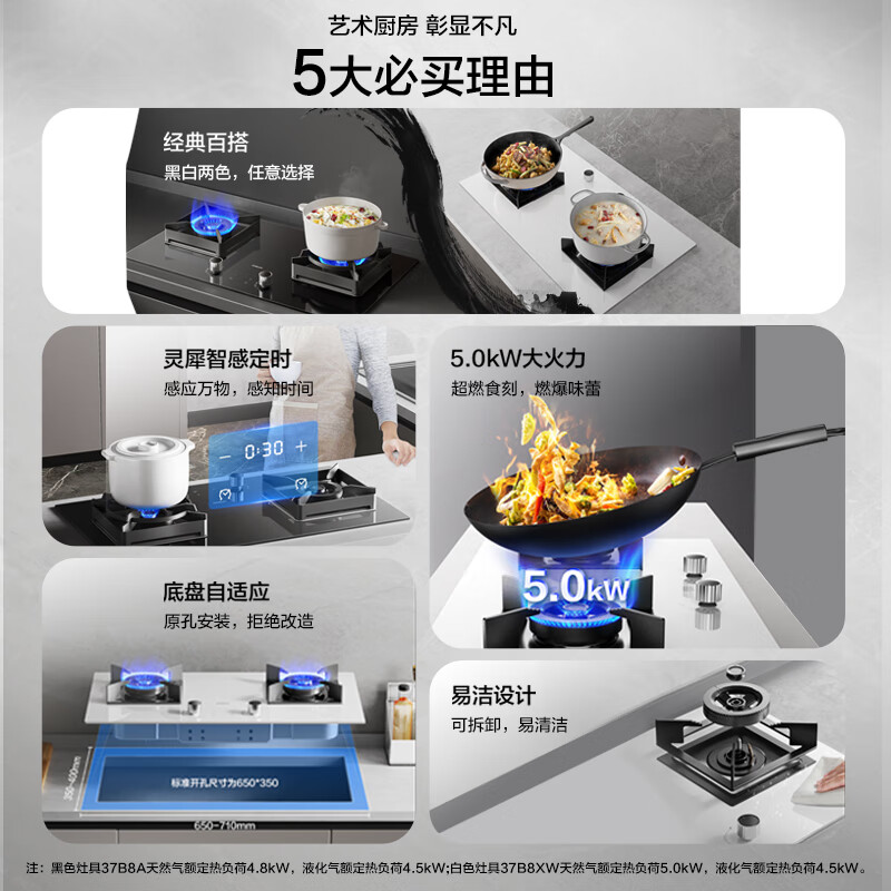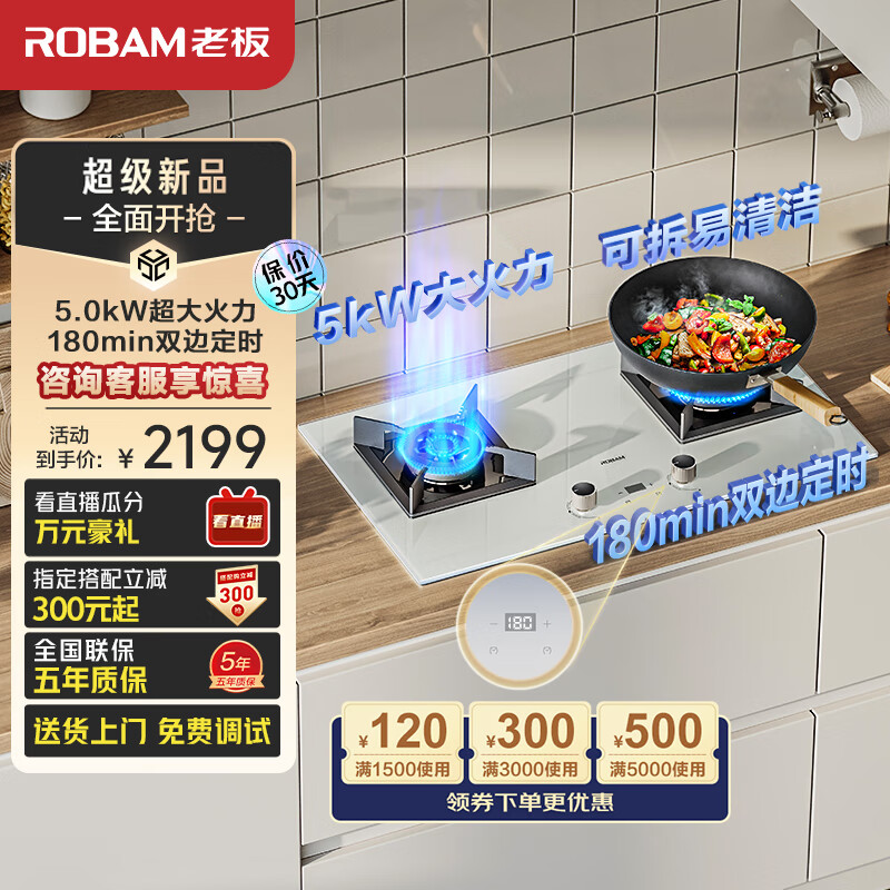 老板(Robam)灵犀燃气灶双灶 家用5.0kW嵌入式定时猛火燃气灶 钢化玻璃灶具灶台白色JZT-37B8XW天然气价格:2199.00元!