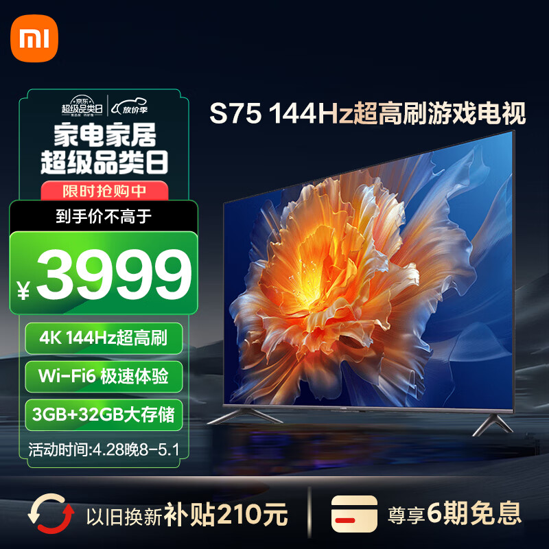 小米电视S75 75英寸4K 144Hz超高刷全速旗舰游戏电视 WiFi 6 3GB+32GB金属屏智能电视L75M9-S价格:3899.00元!