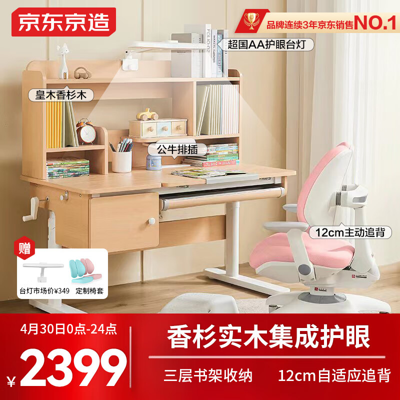 京东京造儿童书桌学习桌椅套装写字桌【香杉实木 AA级台灯】1.2m粉价格:2599.00元!