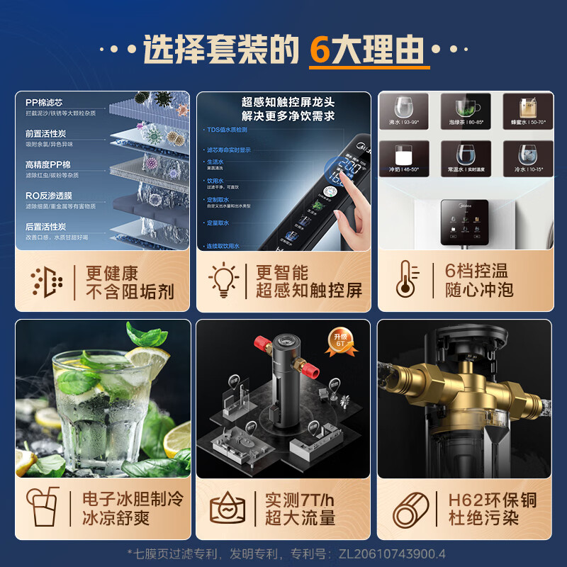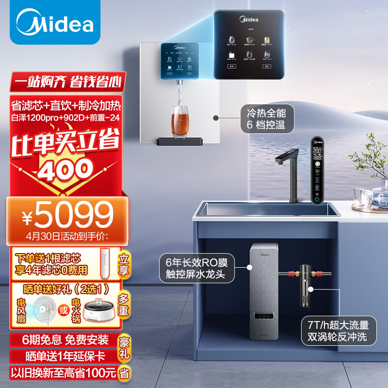 美的(Midea)省芯直饮冷热净水器套装【白泽1200pro+管线机902D+前置24pro】反渗透 家用壁挂式加热一体净饮机价格:5099.00元!