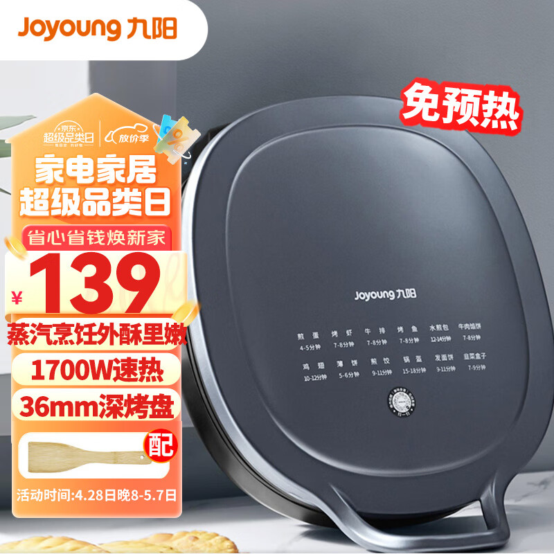 九阳电饼铛 家用电饼铛 煎烤机 36mm加深烤盘 不粘烤盘 蒸汽烤肉薄饼机JK30-GK128价格:139.00元!