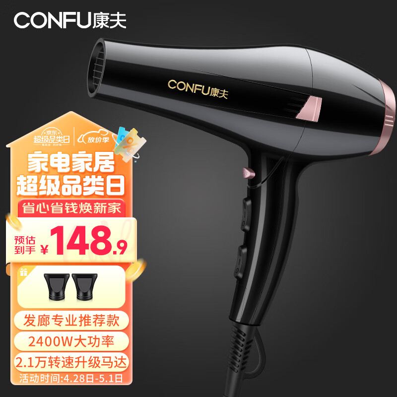 康夫(CONFU)电吹风机家用大功率2400W恒温护发理发店发廊款大风力冷热风快速干发吹风筒 KF-8946价格:158.90元!