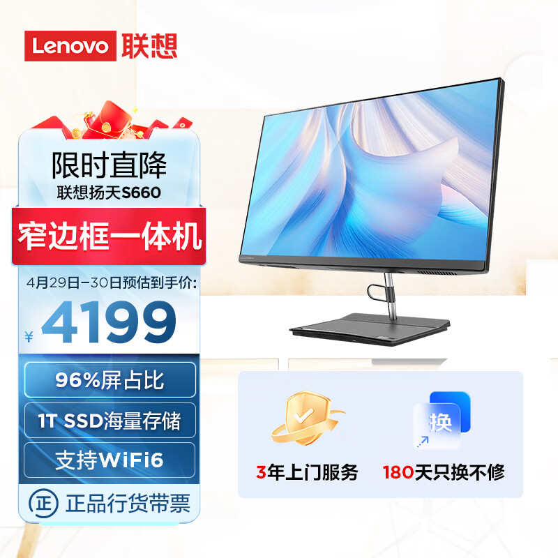 联想(Lenovo)扬天S660 23.8英寸家用高清商用办公一体机台式电脑主机(12代酷睿i5-12450H 16G 1TB SSD)价格:4199.00元!