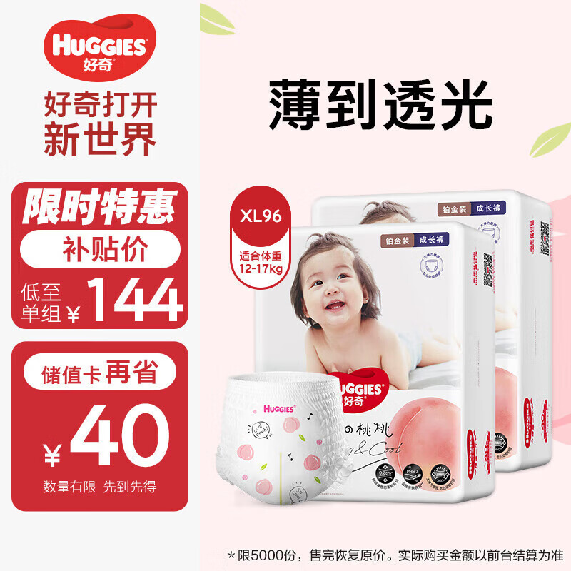 好奇(Huggies)铂金装成长裤XL96片(12-17kg)加大号婴儿尿不湿小桃裤超薄透气价格:144.00元!