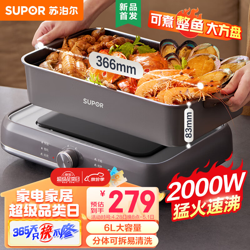 苏泊尔(SUPOR)电火锅电煮锅 火锅锅 电锅火锅专用锅分体式多功能锅6L家用电热锅料理锅 H3724FK871价格:329.00元!