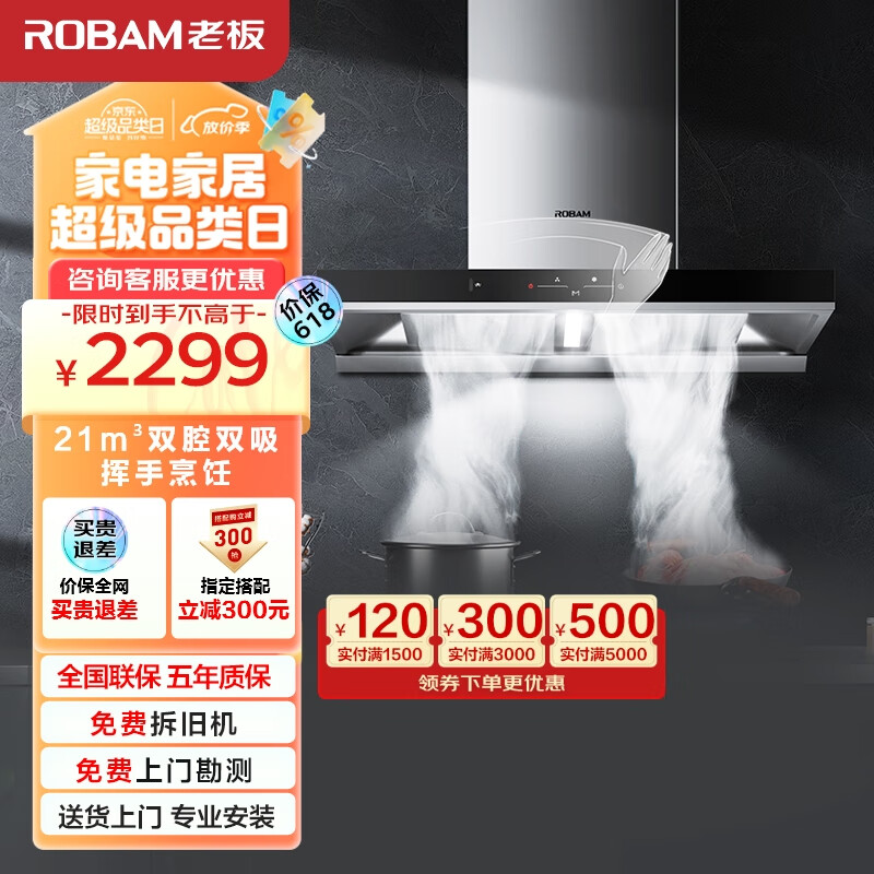 老板(Robam)抽油烟机欧式顶吸式双腔油烟机家用21风量吸油烟机挥手智控免拆洗易洁排油烟机以旧换新60A1抽烟机价格:2299.00元!