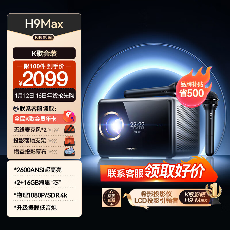 希影H9 Max 家庭K歌影院 投影仪家用 1080P超高清投影 办公投影机家庭影院 专属KTV价格:2599.00元!