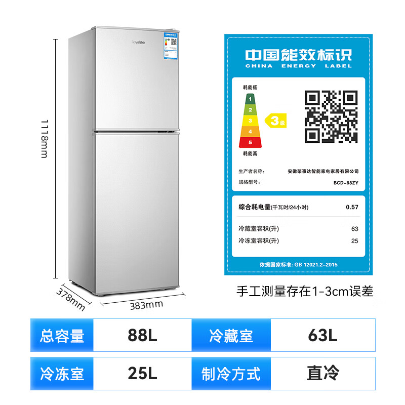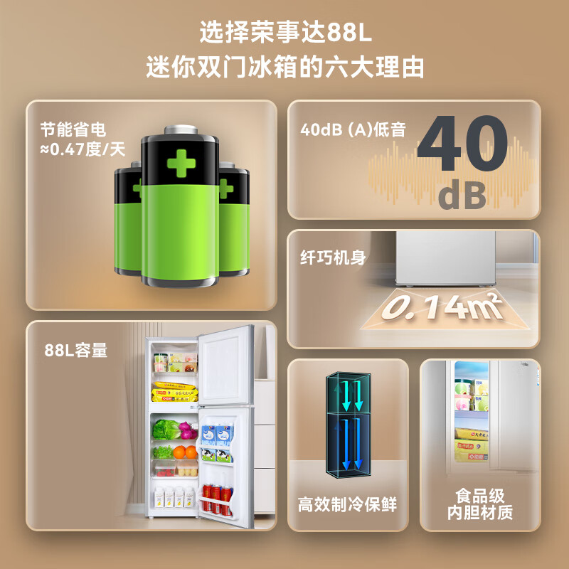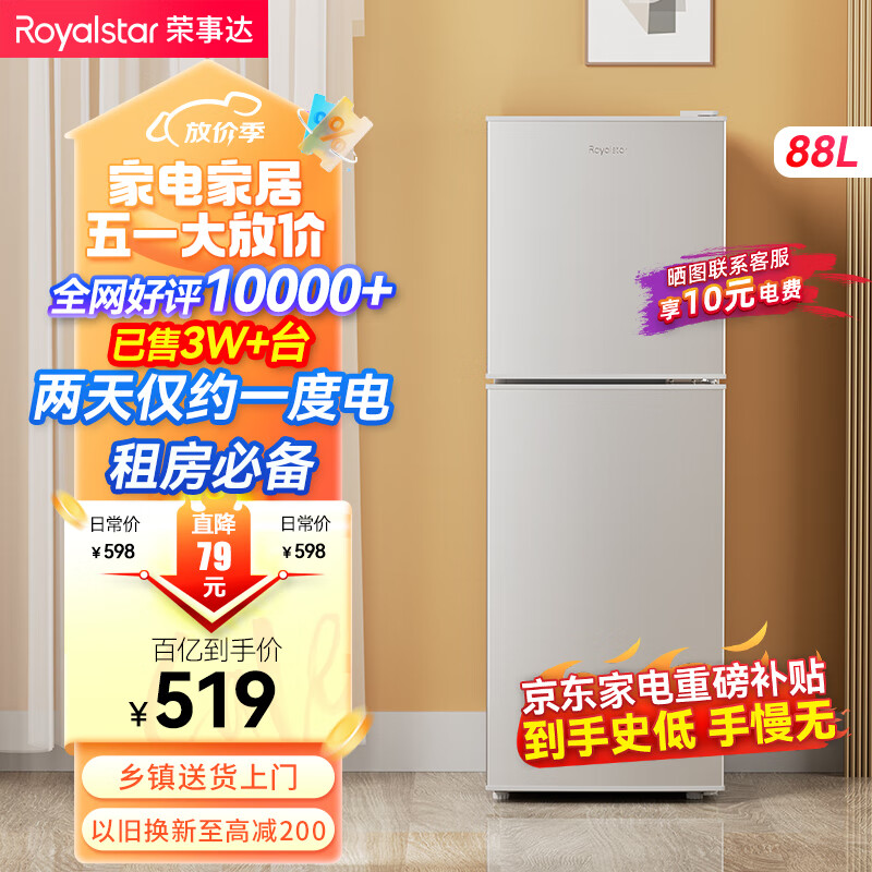 荣事达(Royalstar)88升迷你双开门小冰箱租房宿舍办公室小型家用双温可冷冻冷藏节能环保省电低耗低音BCD-88ZY价格:519.00元!