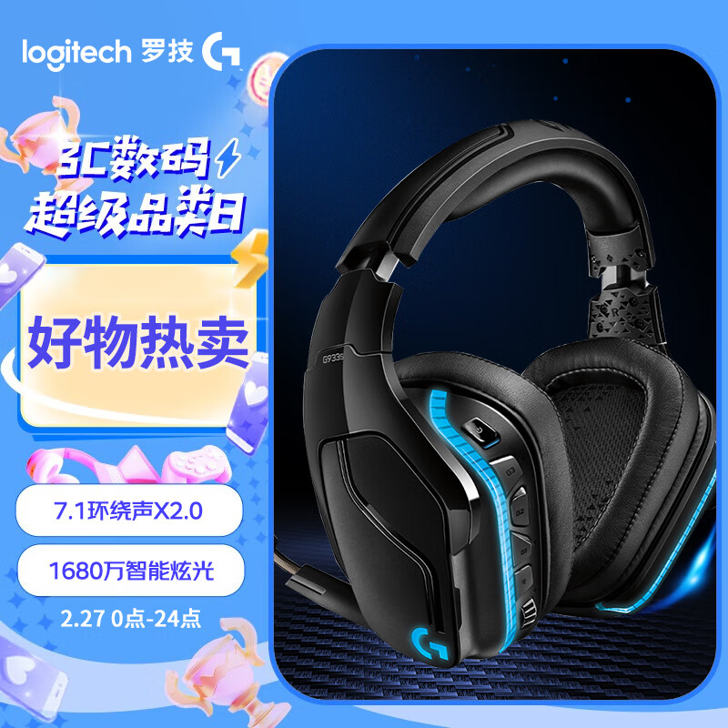 罗技(G)G933s 无线头戴式电脑游戏耳机 7.1环绕声电竞降噪耳机麦克风 RGB灯效 FPS吃鸡LOL听声辩位价格:799.00元!