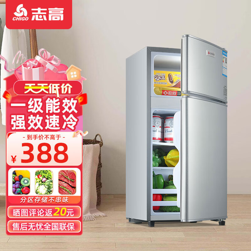志高(CHIGO)76升双门冰箱家用中小型冰箱出租房宿舍办公室电冰箱冷冻冷藏分层一级能效 BCD-76FD价格:408.00元!