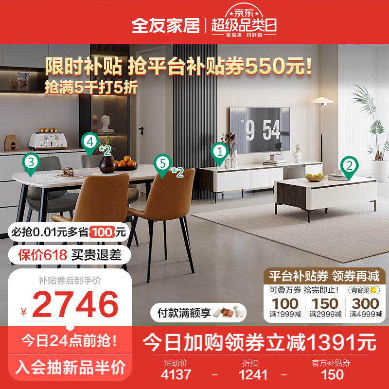 全友家居 时尚拼色客餐厅7件套装DW1181茶几电视柜一桌四椅组合家具价格:4137.14元!