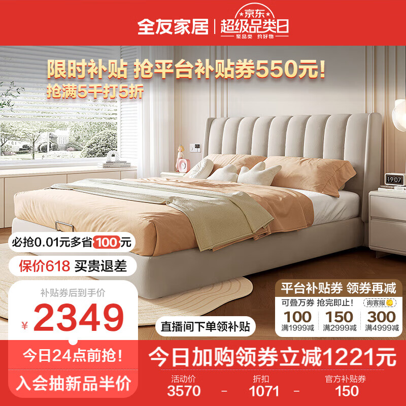 全友家居 床现代简约科技布床双人床高弹海绵床屏齐边布艺大床105207C价格:3570.00元!