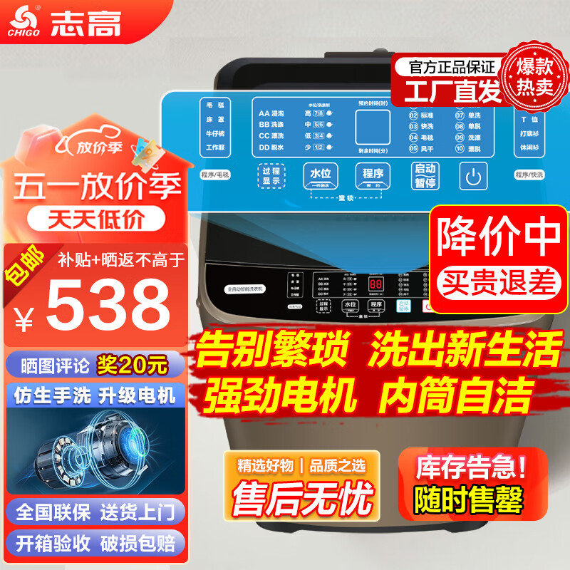志高(CHIGO)洗衣机13公斤大容量家用全自动波轮洗衣机智能洗脱一体机 蓝光洗护强劲电机仿生手洗 金色价格:548.00元!