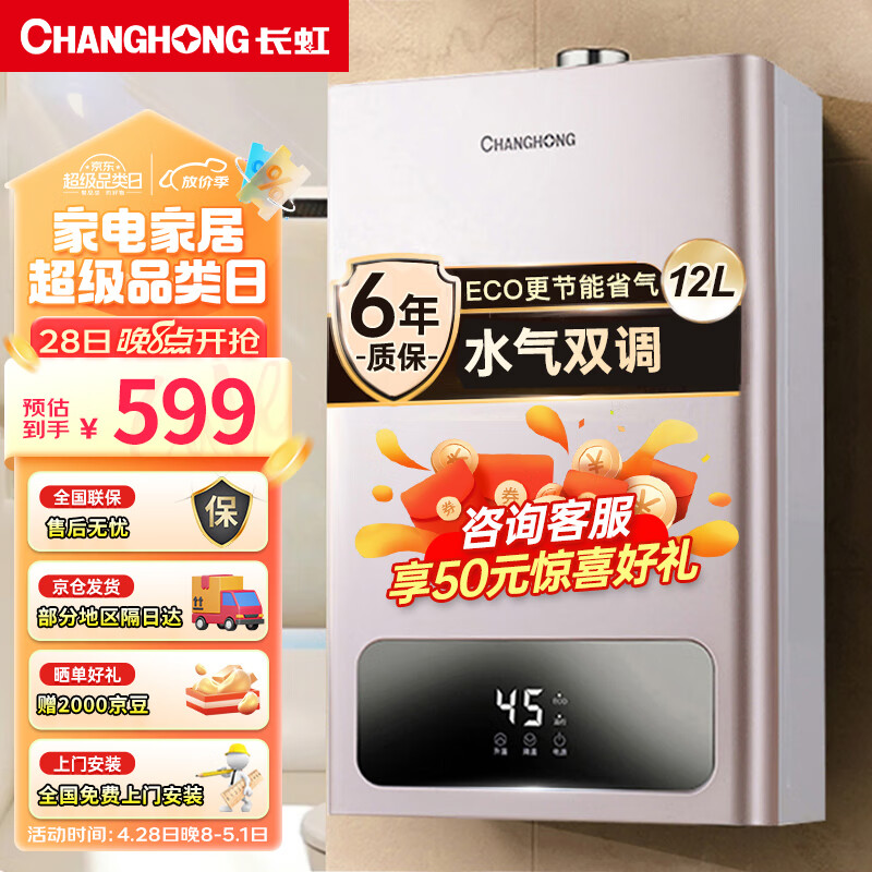 长虹(CHANGHONG)12升燃气热水器水气双调智能预约ECO节能多分段燃烧低水压启动恒温天然气热水器12H2S价格:599.00元!