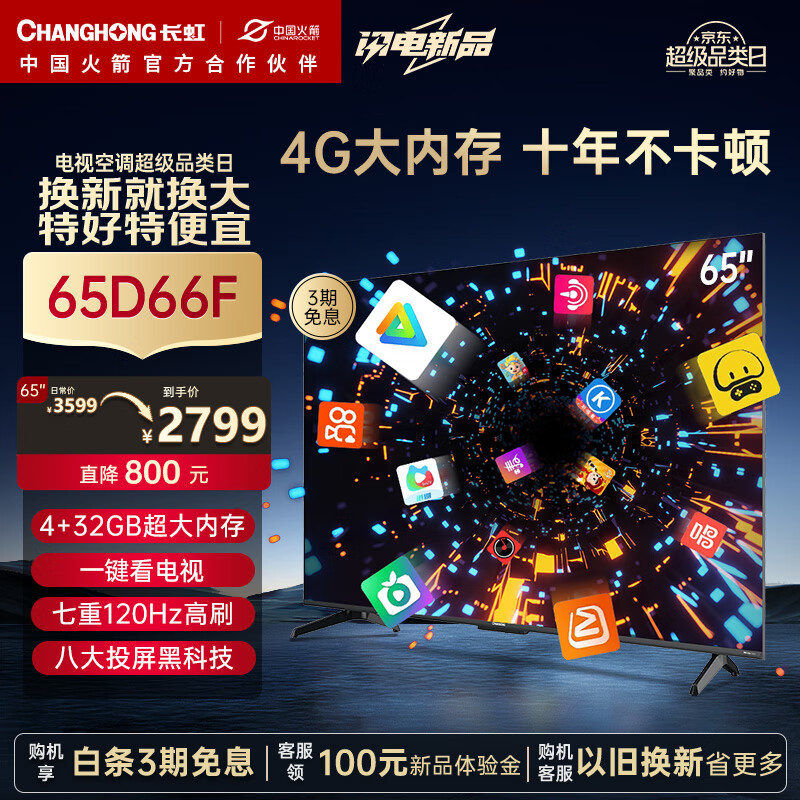 长虹电视65D66F 65英寸4K超高清 4+32GB超大内存 一键看电视120Hz高刷新液晶电视机 以旧换新价格:2799.00元!