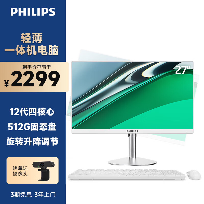 飞利浦S9 27英寸台式一体机电脑 家用学习办公收银主机(12代4核N95 16G 512GSSD WiFi 无线键鼠)白色价格:2299.00元!