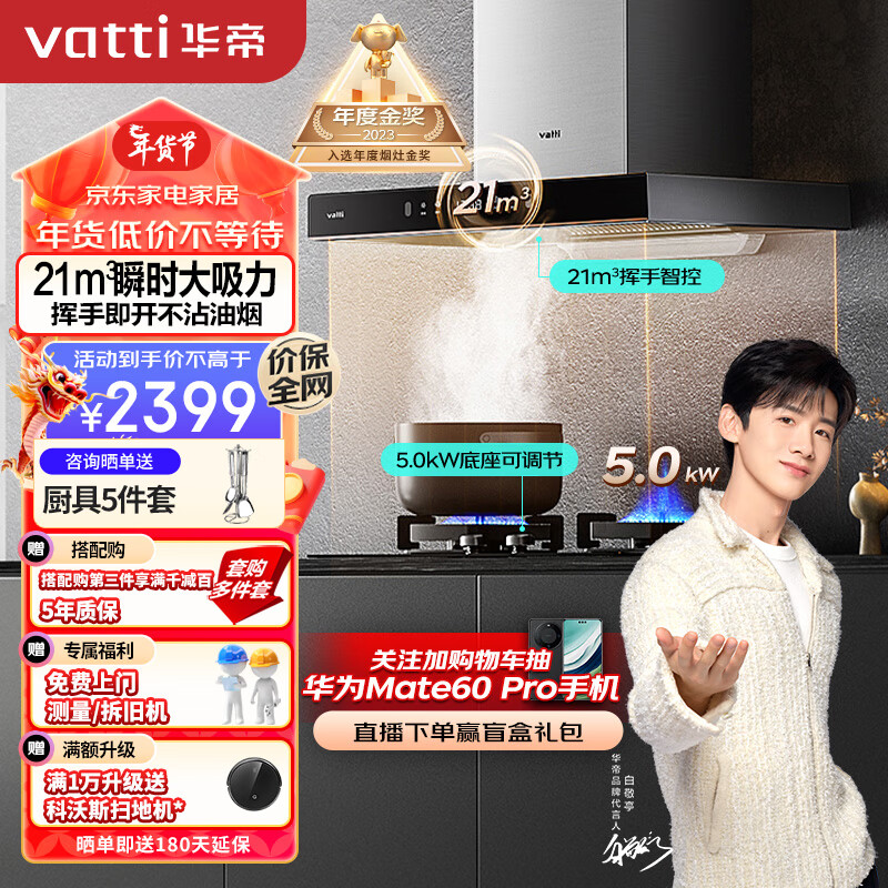 华帝(VATTI)抽油烟机家用大吸力排油烟机燃气灶烟灶套装21风量欧式顶吸吸油烟机灶具套装i11176液化气价格:2399.00元!