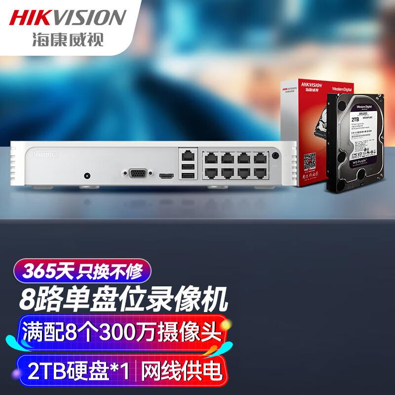HIKVISION海康威视网络硬盘录像机监控8路POE网线供电NVR满配8个摄像头带2T硬盘DS-7108N-F1/8P价格:1029.00元!
