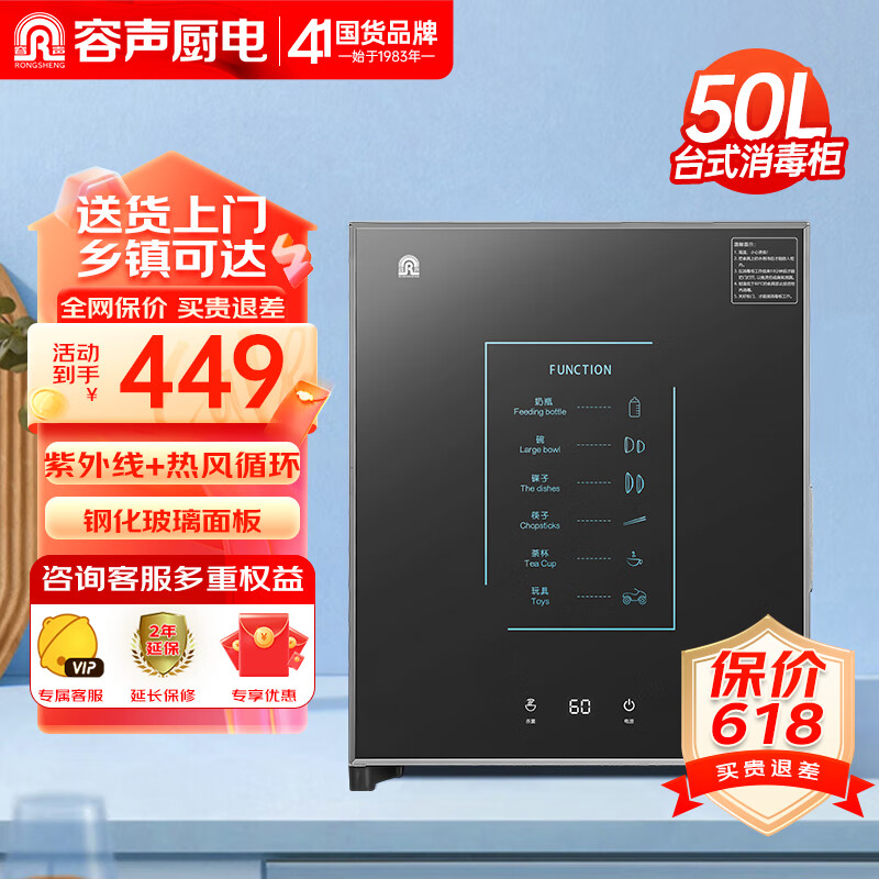 容声(RONGSHENG)消毒柜家用 立式小型消毒碗柜 二消毒 紫外线热风循环 50L保洁柜50-RQ230价格:449.00元!