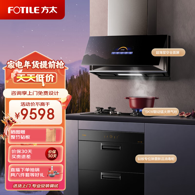 方太(FOTILE)烟灶消三件套 26风量超薄近吸变频烟机 5KW灶 砧板专位除菌智控嵌入式消毒柜P10.I+THF1A+J45EX.I价格:9598.00元!