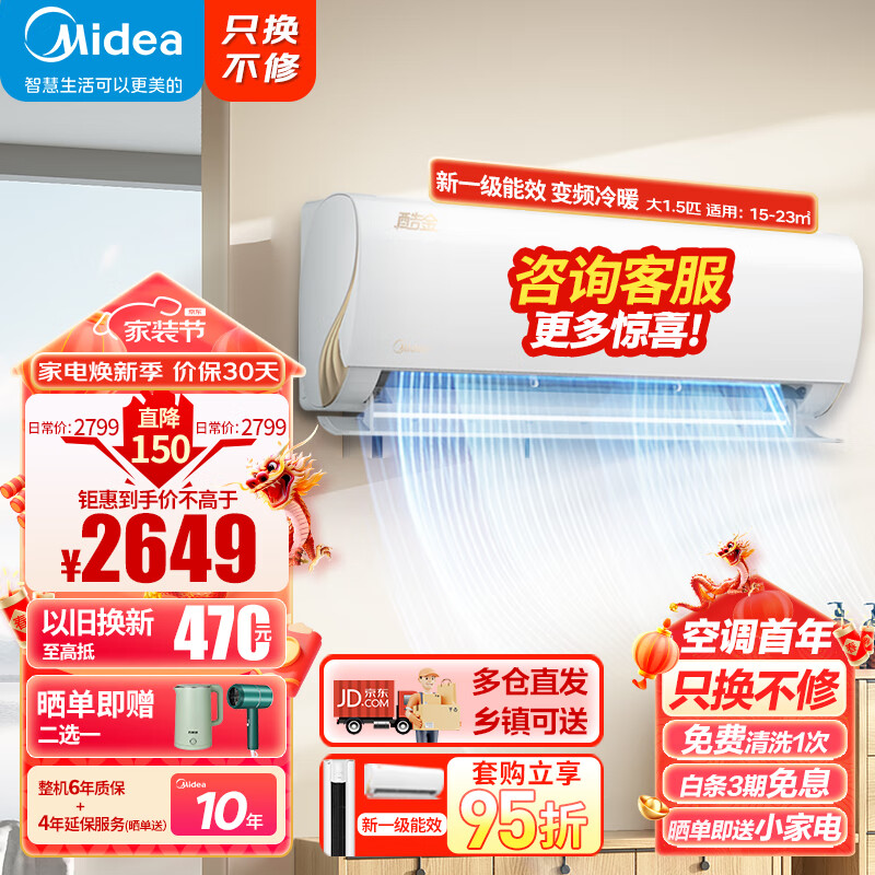 美的(Midea)空调挂机 酷金 1.5匹 新一级能效 变频冷暖自清洁 卧室壁挂式 智能家电 KFR-35GW/N8ZHA1价格:2649.00元!