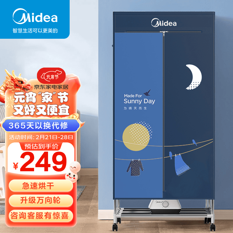 美的(Midea)烘干机家用干衣机小型衣柜式风干烘衣机婴儿衣物暖风32斤大容量定时烘干宿舍衣柜两用 【2023新品】1200W|配轮滑价格:249.00元!