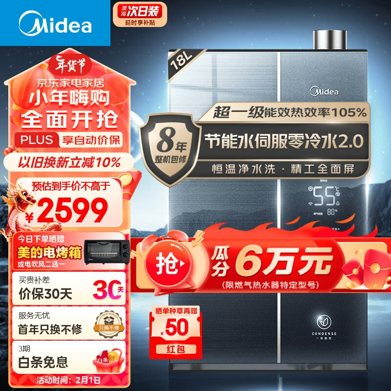 美的(Midea)18升燃气热水器 天然气 超一级能效节能 水伺服恒温 增压零冷水 防冻 大水量 JSLQ30-18LN5影青价格:2599.00元!