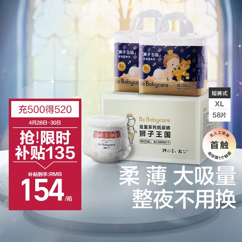 babycare皇冠LaLa裤皇室狮子王国拉拉裤 箱装XL58片大号婴儿尿不湿成长裤价格:154.00元!