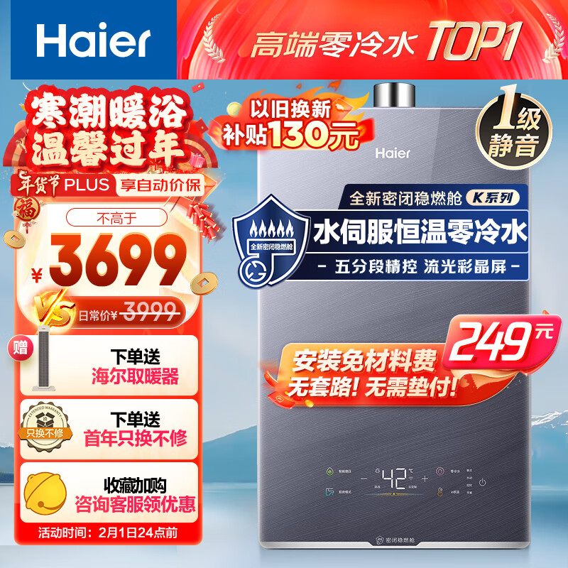 海尔(Haier)16升【大温泉】燃气热水器天然气 TSI增压零冷水 无级变频水伺服 五段微火控温JSQ31-16KN5致远U1价格:3999.00元!